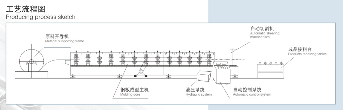 開卷機 成型主機 液壓切刀 電控系統(tǒng) 液壓系統(tǒng) 出料架