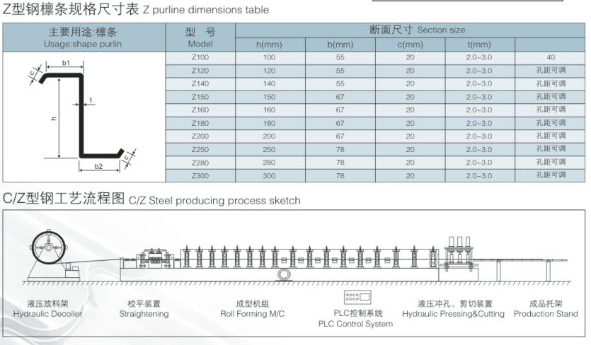 經(jīng)該機輥軋的c型檁條成品具有良好的抗彎抗壓性能,平直度好、全自動定長切割、自動沖孔、自動化程度高,安裝快捷方便。 產(chǎn)品可作為大中型工業(yè)民用建筑的主體受力結構,如廠房、 倉庫、機車庫、飛機庫、展覽館、影劇院、體育場館、集市花棚的屋面承重荷載和墻面支撐。