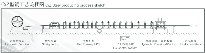 經(jīng)該機(jī)輥軋的C型檁條成品具有良好的抗彎抗壓性能,平直度好、全自動(dòng)定長(zhǎng)切割、自動(dòng)沖孔、自動(dòng)化程度高,安裝快捷方便。